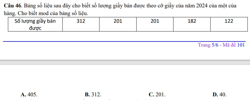 Câu 46. Bảng số liệu sau đây cho biết số lượng giầy bán được theo cỡ giầy của năm 2024 của một của