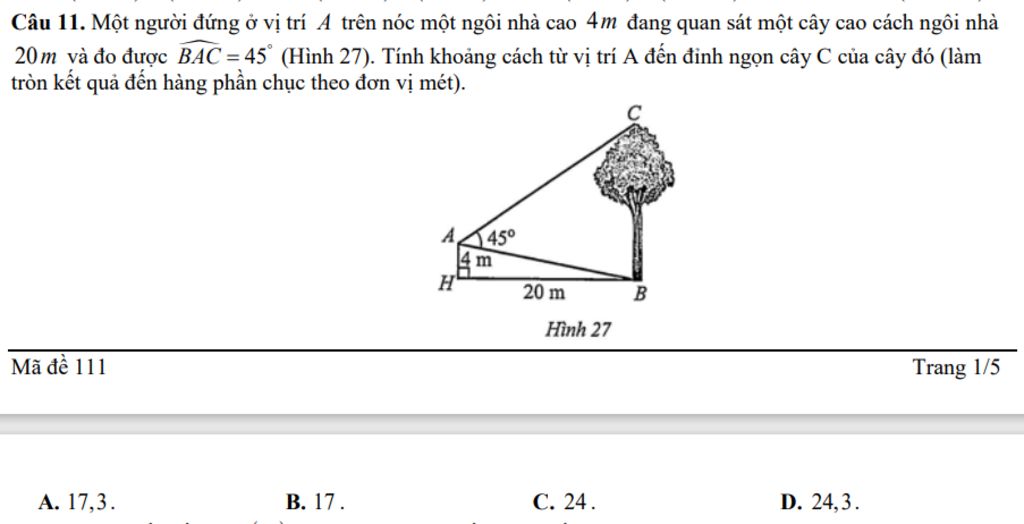 Câu 11. Một người đứng ở vị trí 4 trên nóc một ngôi nhà cao 4m đang quan sát một cây cao cách ngôi nhà