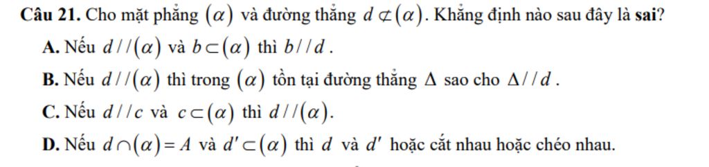 Câu 21. Cho mặt phẳng (a) và đường thẳng d c(a). Khẳng định nào sau đây là sai?