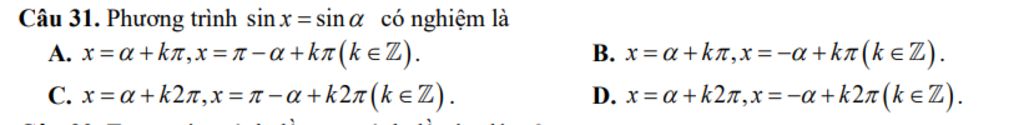 `⇔[(x=∝+ k2\pi),(x=\pi -∝+k2\pi):} (k∈Z)`