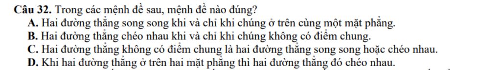 Câu 32. Trong các mệnh đề sau, mệnh đề nào đúng?