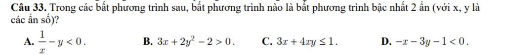 Bất phương trình là bất phương trình bậc nhất hai ẩn là : `-x-3y-1<0 ⇔-x-3y<1`