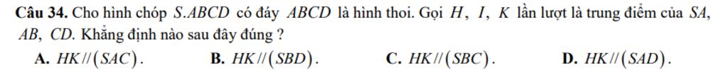 Câu 34. Cho hình chóp S.ABCD có đáy ABCD là hình thoi. Gọi H, I, K lần lượt là trung điểm của SA,