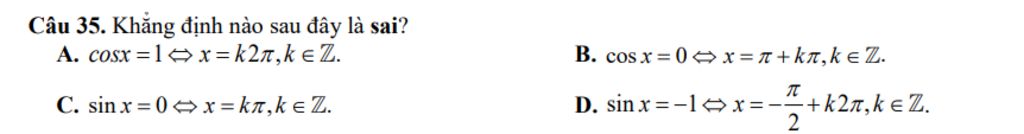 `B. cosx=0<=>x=pi+k pi,k \in ZZ`