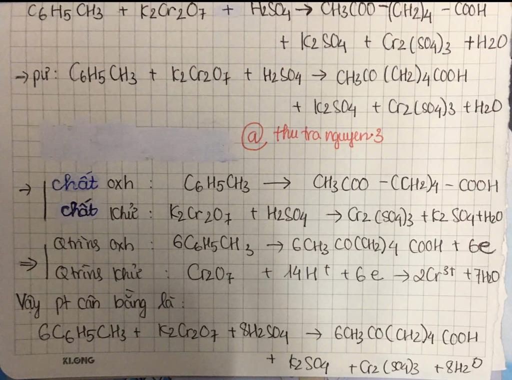 c6h5ch3+k2cr2o7+h2so4 tạo ch3-co-(ch2)4-cooh+k2so4+cr2(so4)3+h2o