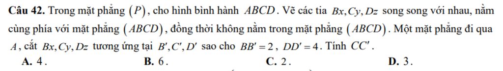 Câu 42. Trong mặt phẳng (P), cho hình bình hành ABCD. Vẽ các tia Bx, Cy, Dz song song với nhau, nằm