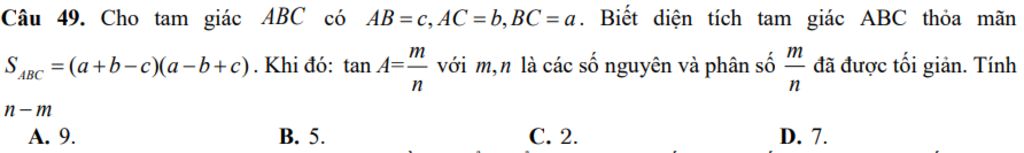 Câu 49. Cho tam giác ABC có AB=c, AC = b,BC=a. Biết diện tích tam giác ABC thỏa mãn