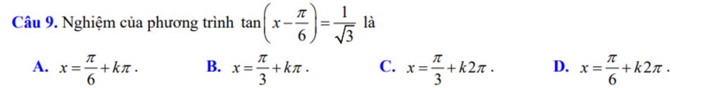 `tan( x - \pi/6 ) = 1/(\sqrt{3})`