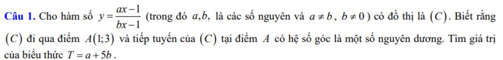 Câu 1. Cho hàm số y= (trong đó a,b, là các số nguyên và a+b, b=0) có đồ thị là (C). Biết rằng