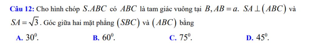 Tam giác vuông SAB: `SA = sqrt(3) , AB = a`