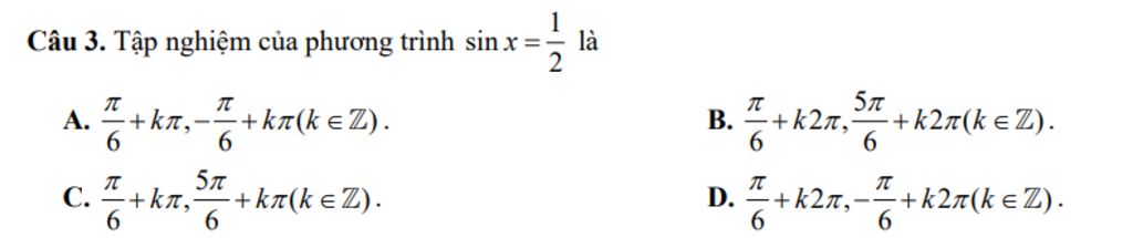 `<=> [ ( x = \pi/6 + 2k\pi ),( x = \pi - \pi/6 + 2k\pi ):}` `( kin ZZ)`