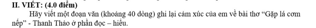 Khi gấp trang thơ lại, em vẫn còn thấy lòng mình nghẹn ngào. Em nhớ đến mẹ, nhớ đến hương nếp thơm, nhớ đến những buổi sáng quê yên bình. Bài thơ khiến em hiểu rằng: trong dòng đời hối hả, điều quý giá nhất vẫn là tình mẹ, là ký ức giản dị nhưng bền chặt của tuổi thơ. “Gặp lá cơm nếp” không chỉ là một bài thơ, mà là lời nhắc nhở dịu dàng về sự biết ơn, về cội nguồn, về những điều bình dị mà thiêng liêng trong cuộc sống.nhatnguyen51