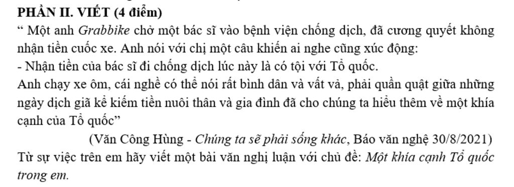 Từ sự việc trên em hãy viết một bài văn nghị luận với chủ đề: Một khía cạnh Tổ quốc trong em.