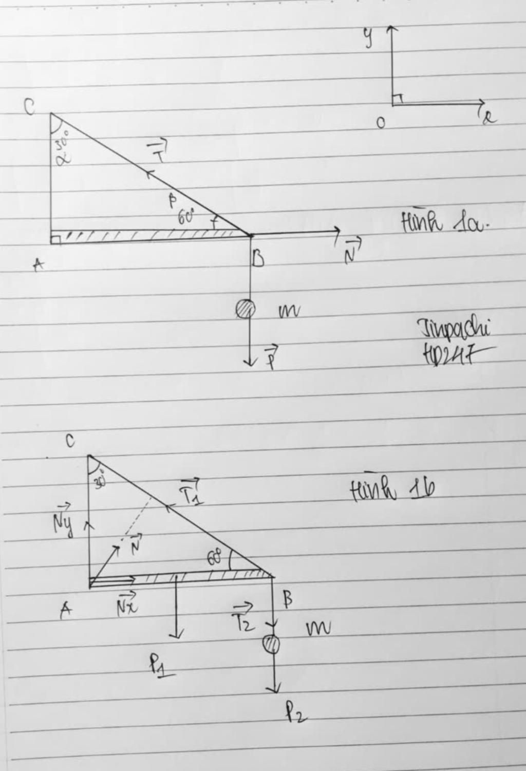 Bài 17. Một vật khối lượng 4kg treo vào tường bởi dây BC và thanh AB. Thanh AB gắn vào tường bằng bản lề A, α = 30o