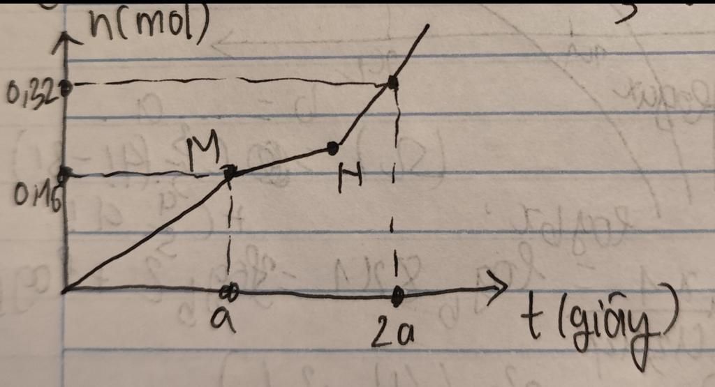 Hỗn hợp X gồm CuSO4, CaCl2 và KCl. Hòa tan hoàn toàn m gam X vào nước, thu được dung dịch Y. Tiến hành điện phân Y các điện cực trơ, màng ngăn xốp, dòng điện có cường độ không đổi. Tổng số mol khí thu được trên cả hai điện cực (n) phụ thuộc vào thời gian điện phân (t) được mô tả như đồ thị bên dưới (đồ thị gấp khúc tại các điểm M, N). Giả sử hiệu suất điện phân là 100%, bỏ qua sự bay hơi của nước.