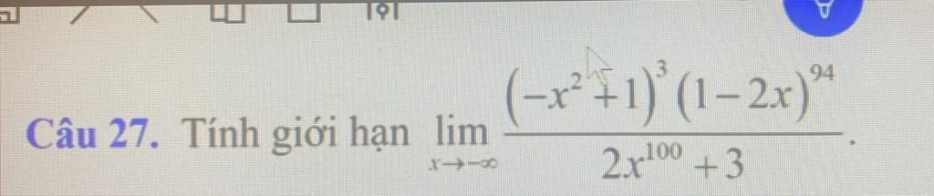 `=lim_{x->-∞} (((-x^2+1)^3 (1-2x)^94)/x^100)/[(2x^100+3)/x^100]`
