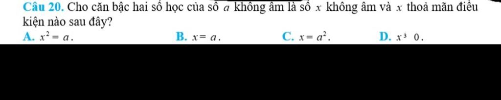 `@` Định nghĩa: Căn bậc `2` số học của số `a` không âm là số `x` sao cho `x^2 = a`