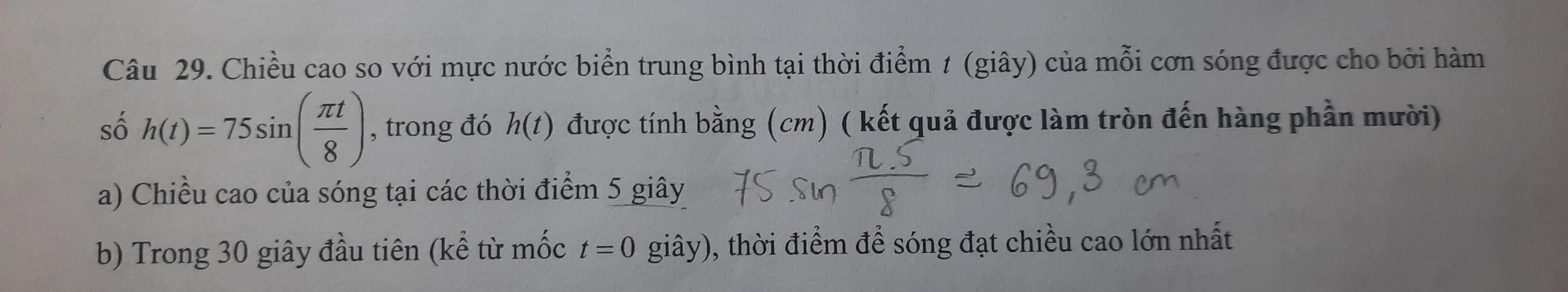 $\to h(t)$ lớn nhất $=75\to \sin(\dfrac{\pi t}8)=1$