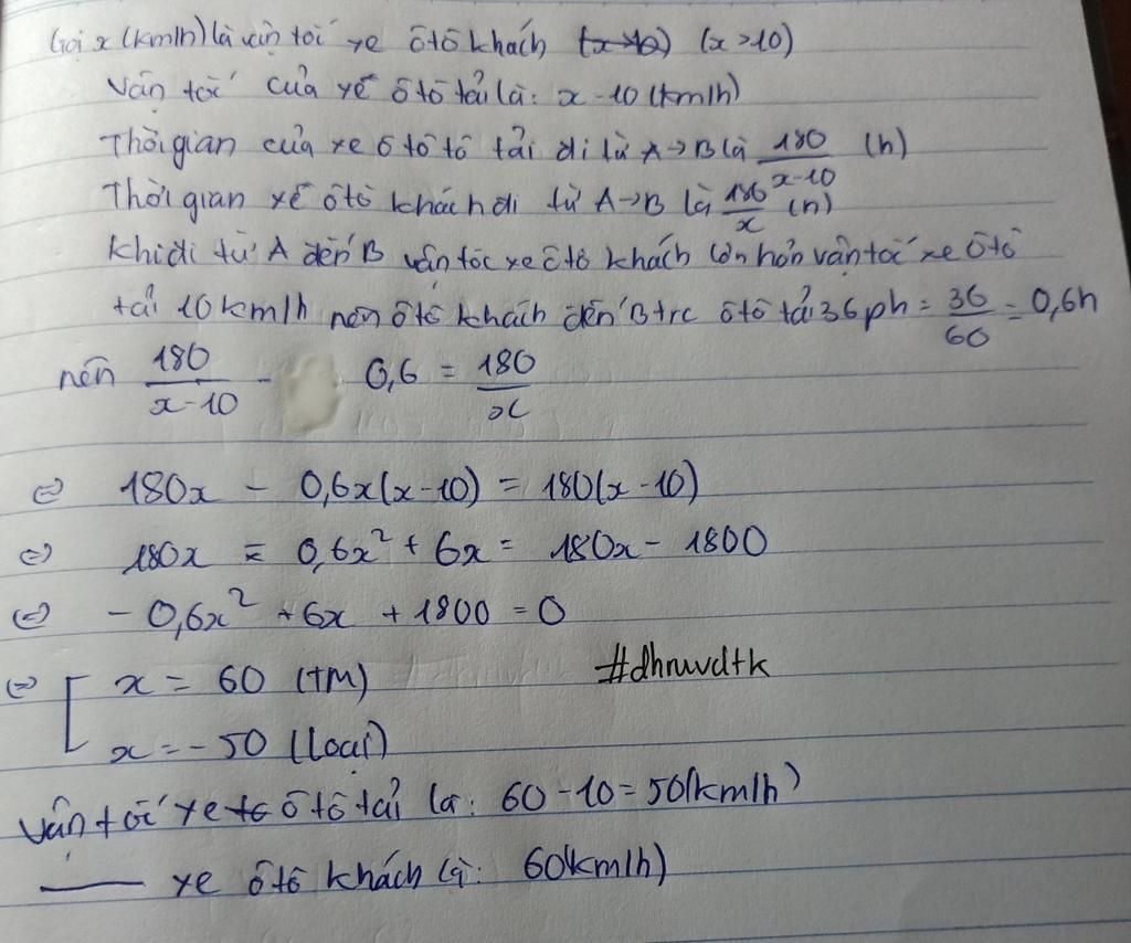Một ô tô khách và 1 ô tô tải cùng xuất phát từ địa điểm A và đi đến B đường dài 180km do vận tốc của ô tô khách lớn hơn vận tốc ô tô tải 10km/h nên ô tô khách đến B trước ô tô tải 36 phút.Tính vận tốc mỗi ô tô.