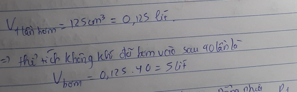 Thể tích khí ở áp suất 1atm bơm vào sau 40 lần là: