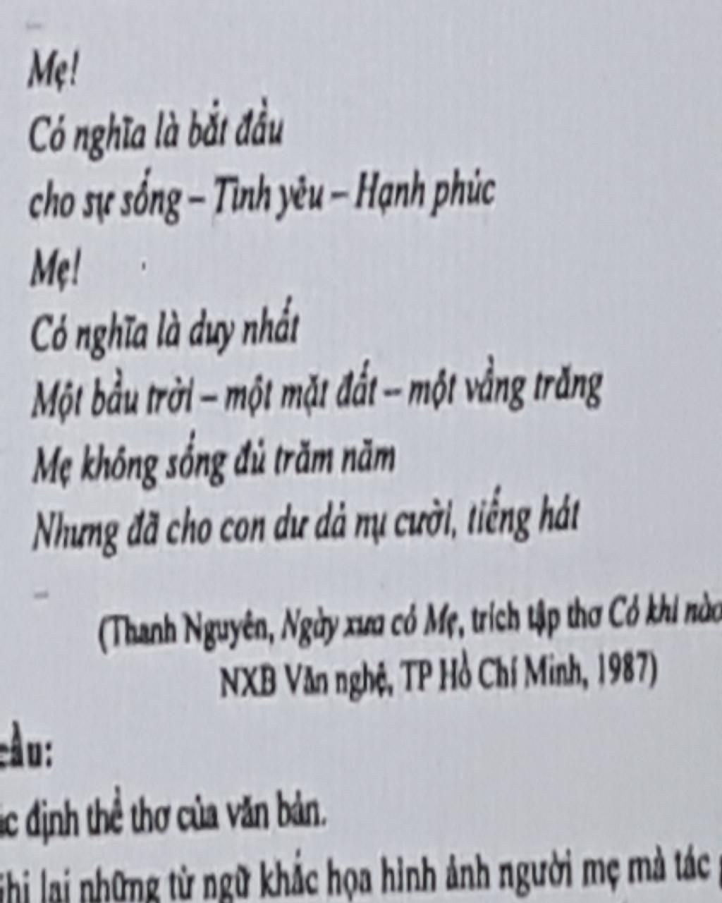 viết đoạn văn khoảng 200 chữ phân tích 8 dòng thơ cuối của bài thơ ngày xưa có mẹ của tác giả thanh nguyên
