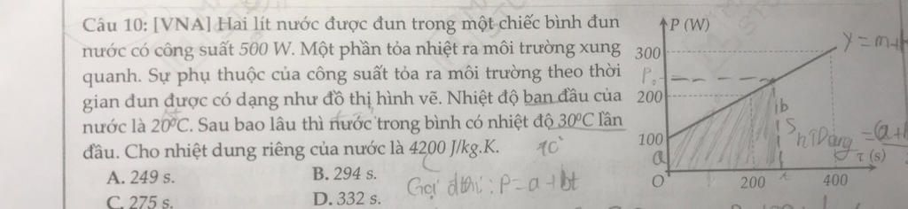 Gọi thòi gian để nước tăng nhiệt độ từ 200c đến 300c là T thì nhiệt lựng TB toả ra trong thời gian này là : Ptb=100+0,25t