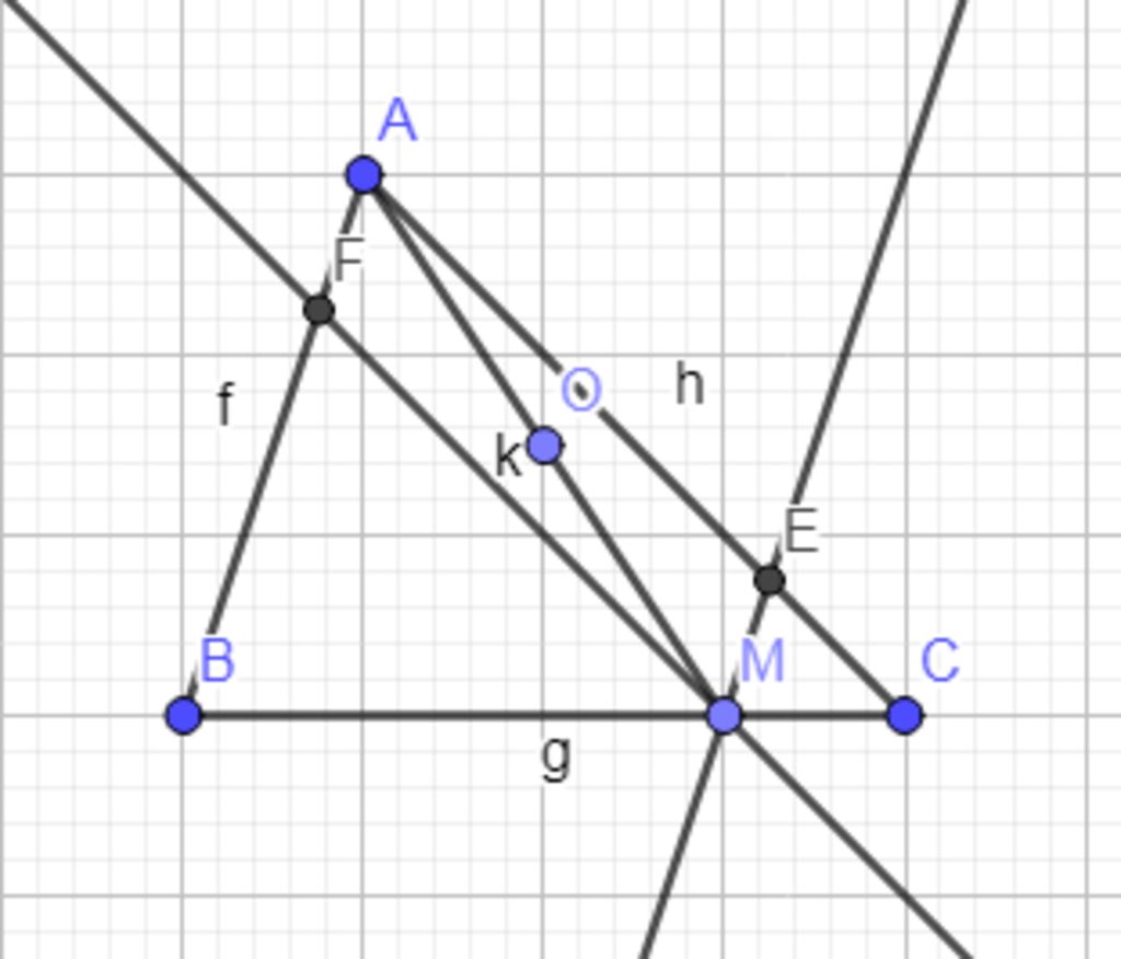 Cho tam giác ABC , điểm M bất kỳ thuộc cạnh BC . Qua M kẻ tia ME // AB ( E thuộc AC ) , MF //AC ( F thuộc AB ) . Gọi O là trung điểm của AM . Chứng minh ba điểm E ,O , F thẳng hàng