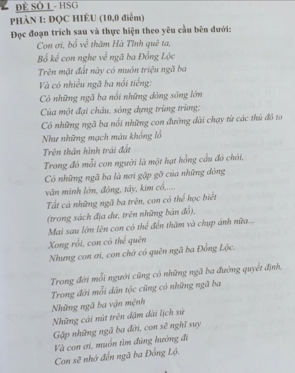 Câu 1: Theo em, vì sao người cha lại dặn con không được quên ngã ba Đồng Lộc?