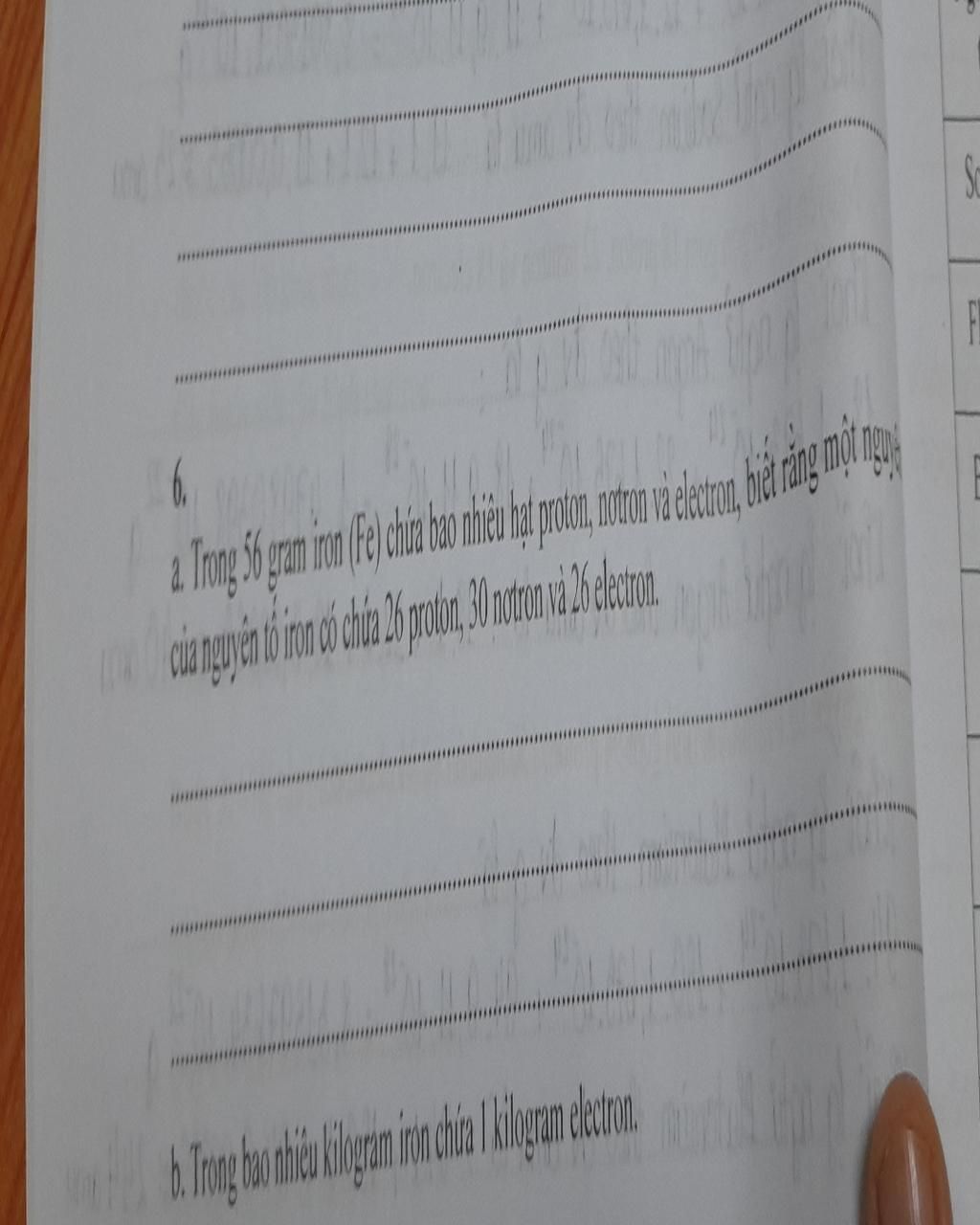 b. ta có $\rm m_{e} có trong 56g Fe =156,572.10^{23} . 9,11.10^{-31}=1,43.10^{-5} (kg)$