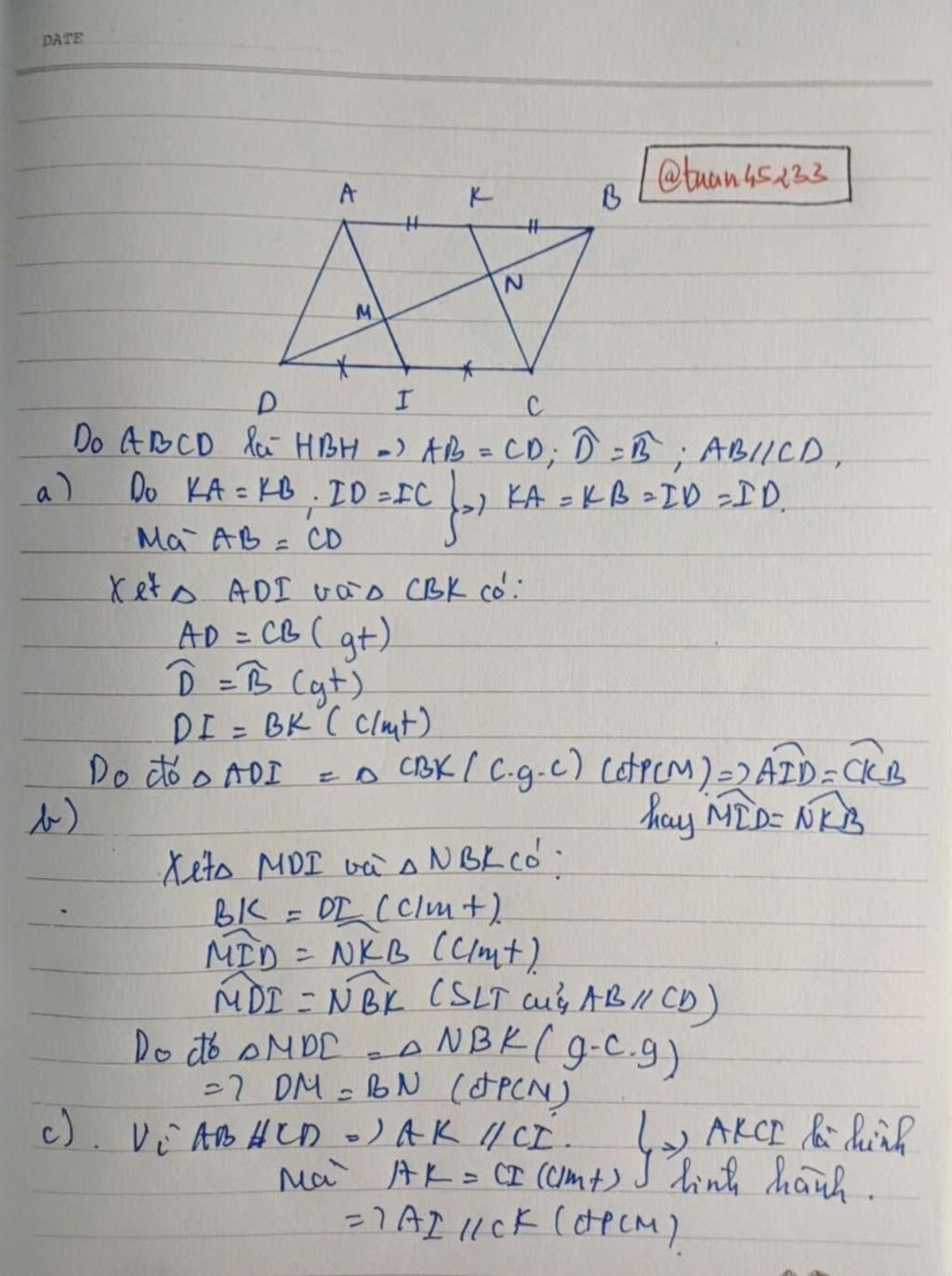 Cho hình bình hành ABCD. Gọi K, I lần lượt là trung điểm của AB và CD. Gọi M, N là giao điểm của AI, CK với BD. Chứng minh: