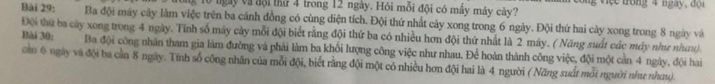 Bài 29: Ba đội máy cày làm việc trên ba cánh đồng có cùng diện tích. Đội thứ nhất cày xong trong 6 ngày. Đội thứ hai cày xong trong 8 ngày và