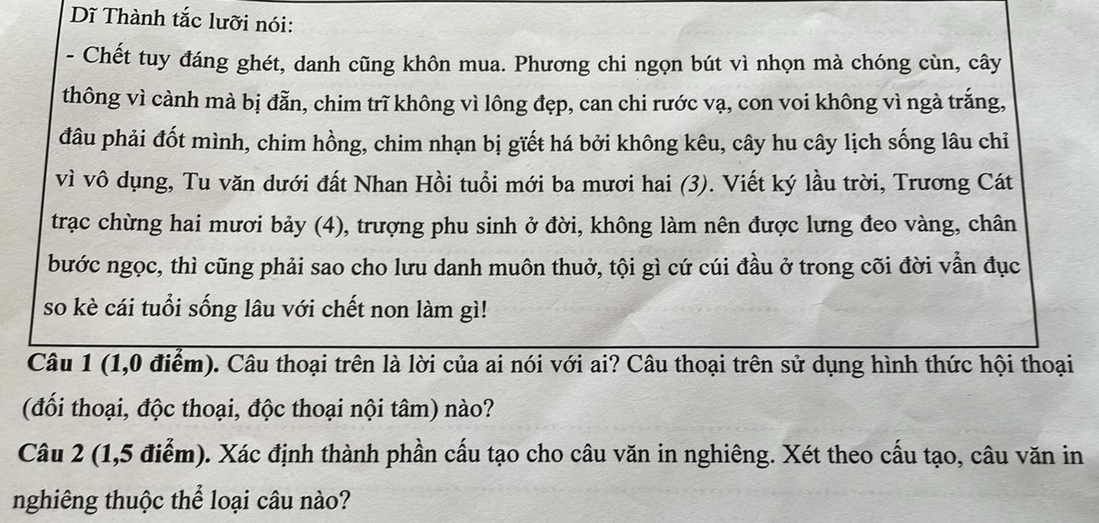 `=>` Câu in nghiêng là '' Phương chi ngọn bút vì nhọn mà chóng cùn, cây thông vì cành mà bị đẵn, chim trĩ không vì lông đẹp, can chi rước vạ, con voi không vì ngà trắng, đâu phải đốt mình, chim hồng, chim nhạn bị giết há bởi không kêu, cây hu cây lịch sống lâu chỉ vì vô dụng, Tu văn dưới đất Nhan Hồi tuổi mới ba mươi hai.''