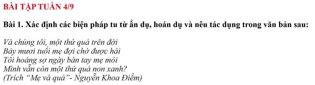 `+` Biện pháp hoán dụ nói lên những vất vả, gian nan, khổ cực của mẹ vì con; ''bàn tay'' là chỉ sức khỏe của mẹ; ''mỏi'' là chỉ sự già yếu. Biện pháp ẩn dụ ''thứ quả non xanh'' ý chỉ ẩn ý rằng bản thân con vẫn chưa khôn lớn, trưởng thành nhưng mẹ đã dần đến cái tuổi xế chiều.