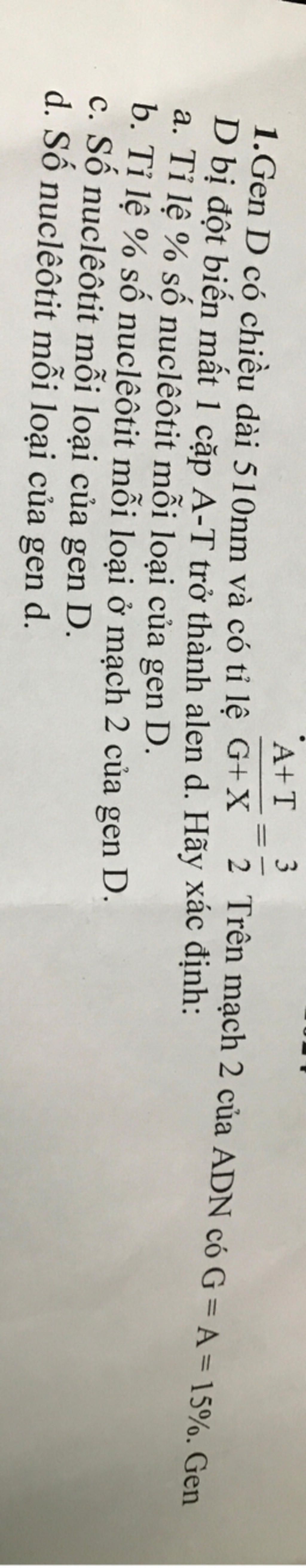 `d)` Gen D bị đột biến mất 1 cặp `A-T` trở thành gene d.