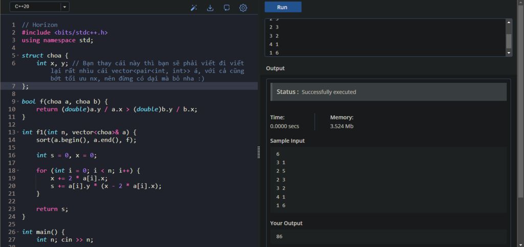 int x, y; // Bạn thay cái này thì bạn sẽ phải viết đi viết lại rất nhìu cái vector<pair<int, int>> á, với cả cũng bớt tối ưu nx, nên đừng có dại mà bỏ nha :)