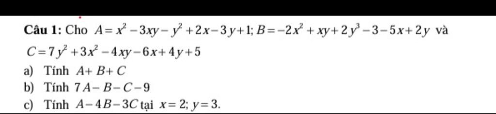 `c) A - 4B - 3C = (x^2 - 3xy - y^2 + 2x - 3y + 1) - 4.(-2x^2 + xy + 2y^3 - 3 - 5x + 2y) - 3.(7y^2 + 3x^2 - 4xy - 6x + 4y + 5)`