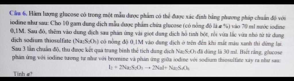 $\Rightarrow n_{I_2\text{phản ứng với glucose}}=0,007-0,0015=0,0055$ mol