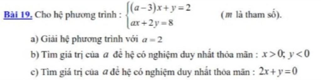 Ta có: `{((a-3)x+y=2(1)),(ax+2y=8(2)):}`