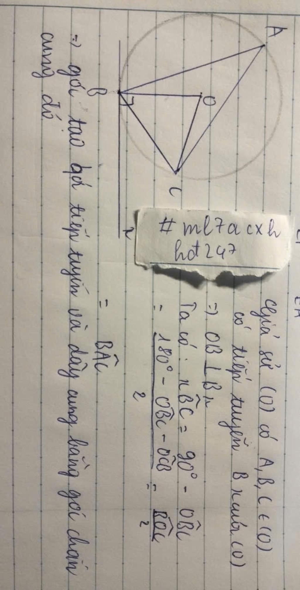 Chứng minh trong một đường tròn, góc tạo bởi tia tiếp tuyến và dây cung và góc nội tiếp cùng chắn một cung bằng nhau