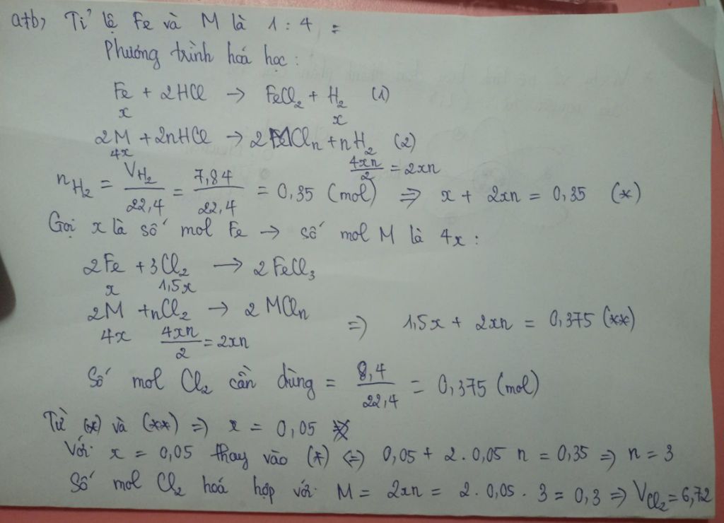 Câu 5:Có hỗn hợp gồm bột sắt và bột kim loại M có hoá trị n. Nếu hòa tan hết hỗn hợp này trong dung dịch HCl, thu được 7,84 lít khí H2 (đktc). Nếu cho hỗn hợp trên tác dụng với khí Cl2 thì thể tích khí Cl2 cần dùng là 8,4 lít (đktc). Biết tỉ lệ nguyên tử Fe và kim loại M là 1 : 4.