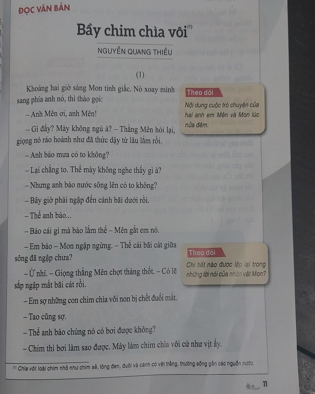 Mon choàng tỉnh lúc hai giờ sáng, gọi Mên dậy, lo lắng hỏi về đàn chim chìa vôi ngoài bờ sông. Hai đứa quyết định đi ra đó để đưa những chú chim non vào bờ. Chiều hôm trước, nước sông đã dâng rất nhanh, và khi ra đến nơi, chúng thấy dòng nước gần như nuốt chửng cả dải cát. Nước dâng đến đâu, chim bố mẹ lại dẫn đàn con tránh lên cao đến đó. Khi vừa tới bờ, Mon và Mên được chứng kiến cảnh bầy chim bắt đầu tung cánh bay lên. Bất ngờ, một con chim non kiệt sức rơi xuống dòng nước. Chim mẹ lập tức sà xuống, xòe cánh bay quanh và cất tiếng kêu như tiếp thêm sức mạnh cho con. Đúng lúc đôi chân nhỏ bé, run rẩy của chim non chạm vào mặt nước, đôi cánh yếu ớt của nó đập mạnh một nhịp quyết định, đưa tấm thân bé bỏng vượt ra khỏi dòng nước và bay vút lên cao. Trước khoảnh khắc ấy, Mon và Mên xúc động rơi nước mắt mà chẳng hề hay biết.