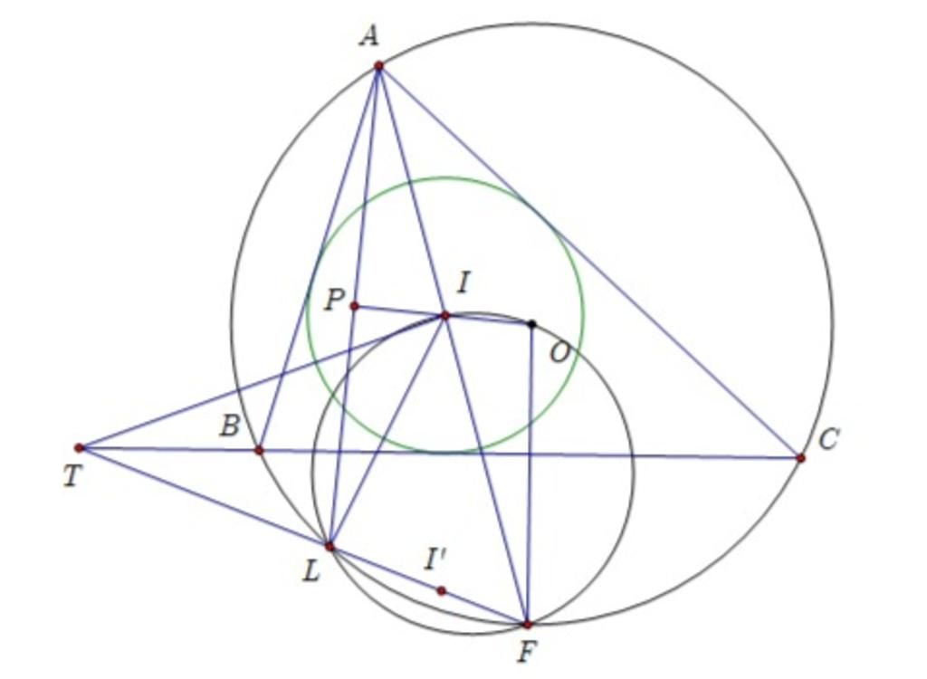 Cho tam giác `ABC` nội tiếp `(O)` ngoại tiếp `(I), I'` đối xứng với `I` qua `BC, F` là điểm chính giữa cung `BC, I'F` cắt `(O)` tại `L`. CM một trong hai ý sau : `OILF` nội tiếp hoặc `OI \bot AL`