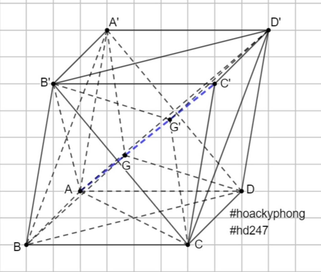 Cho hình hộp ABCD.A'B'C'D'. Gọi G, G' lần lượt là trọng tâm tam giác BDA' và CB'D'. Chứng minh các điểm A,G,G',C' thẳng hàng