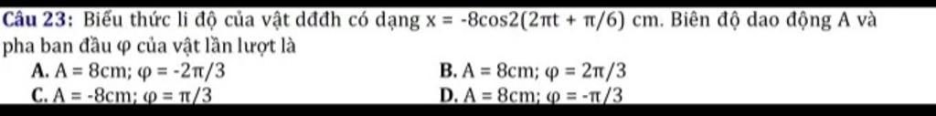 `A. ` `A = 8 cm; varphi = [- 2pi]/3 rad`