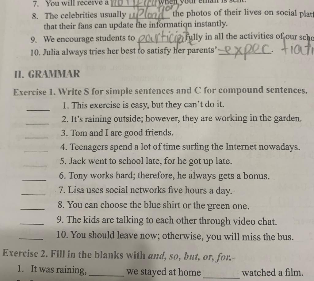 2.C ( vì trong câu này có 2 vế "It's raining outside" và "they're working in the garden")