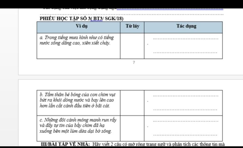 `=>` T/d: Từ láy ''bé bỏng'' được sử dụng trong câu văn `b)` có tác dụng diễn tả dáng vẻ kích thước của hình ảnh: ''Tấm thân những chú chim chìa vôi non'', từ đó cho thấy những chú chim chìa vôi non tuy còn nhỏ bé, yếu ớt nhưng đã rất dũng mãnh, kiên định để vượt qua cơn mưa lớn.