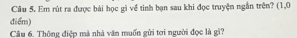 → Qua truyện ngắn đó em rút ra được bài học về tình bạn là tình bạn không phải cần tiền là mua được mà nó là sự gắn bó chặt chẽ, sự đồng cảm, chân thành, quan tâm, chia sẽ những niềm vui, nỗi buồn cùng nhau. Những khi ta gặp khó khăn và đồng hành cùng nhau trong cuộc sống đầy rẫy khó khăn. Khi ta hiểu được ý nghĩa của tình bạn thật sự thì sẽ giúp ta có những mối quan hệ lâu dài và tốt đẹp.