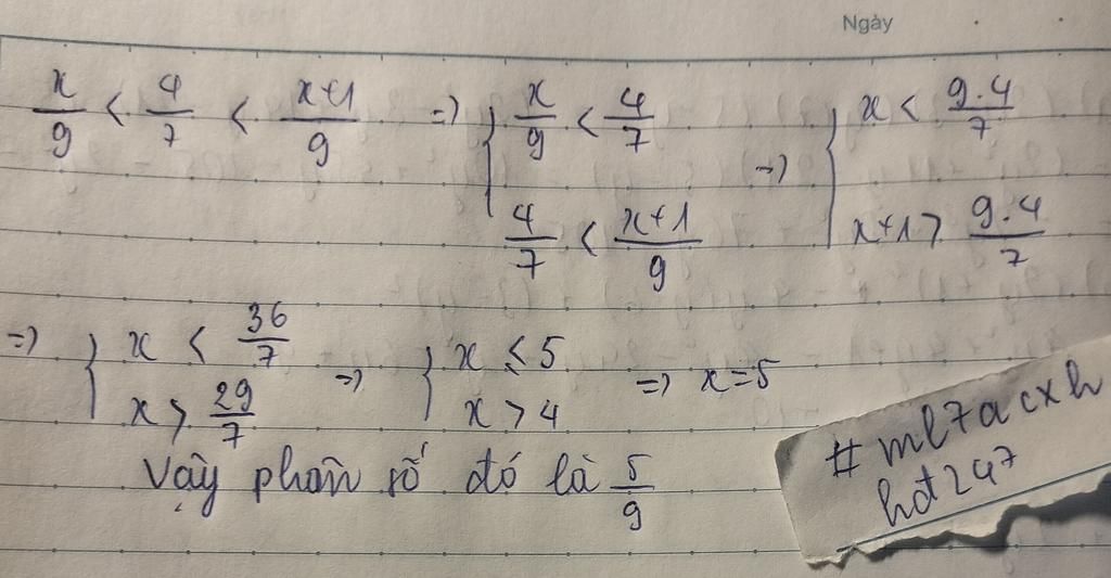 tìm phân số x/9 (x thuộc Z) sao cho x/9 < 4/7 < x+1/9