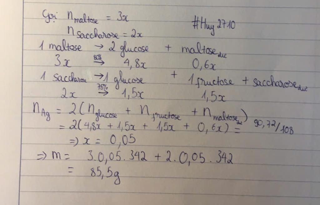 $n_{glucose} = 2n_{maltose(pư)} + n_{saccharose(pư)} = 2.3a.80\% + 2a.75\% = 6,3a(mol)$