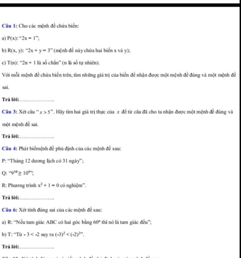 Câu 4: Phát biểu phủ định của các mệnh đề